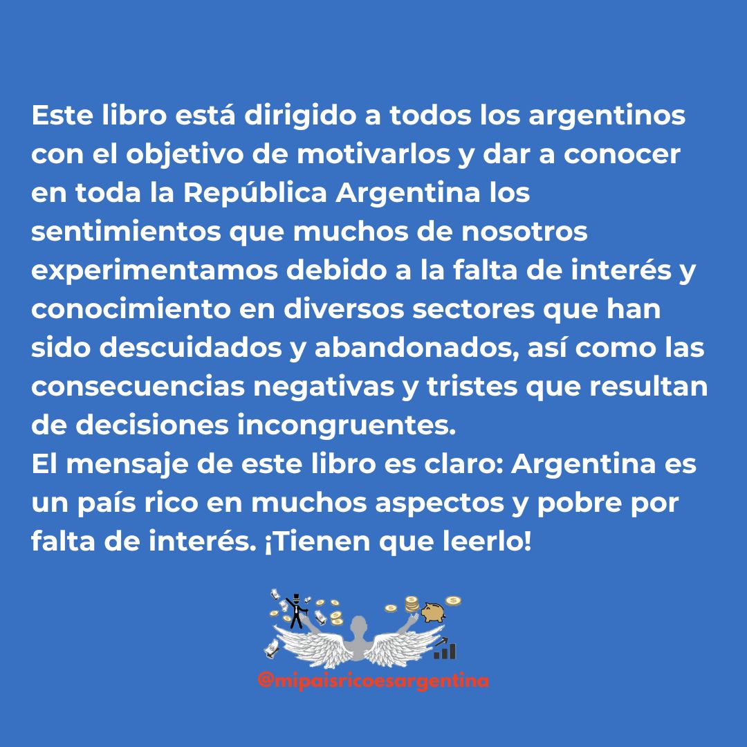Este libro está dirigido a todos los argentinos con el objetivo de motivarlos y dar a conocer en toda la República Argentina los sentimientos que muchos de nosotros experimentamos debido a la falta de interés y conocimiento en diversos sectores que han sido descuidados y abandonados, así como las consecuencias negativas y tristes que resultan de decisiones incongruentes. El mensaje de este libro es claro: Argentina es un país rico en muchos aspectos y pobre por falta de interés.